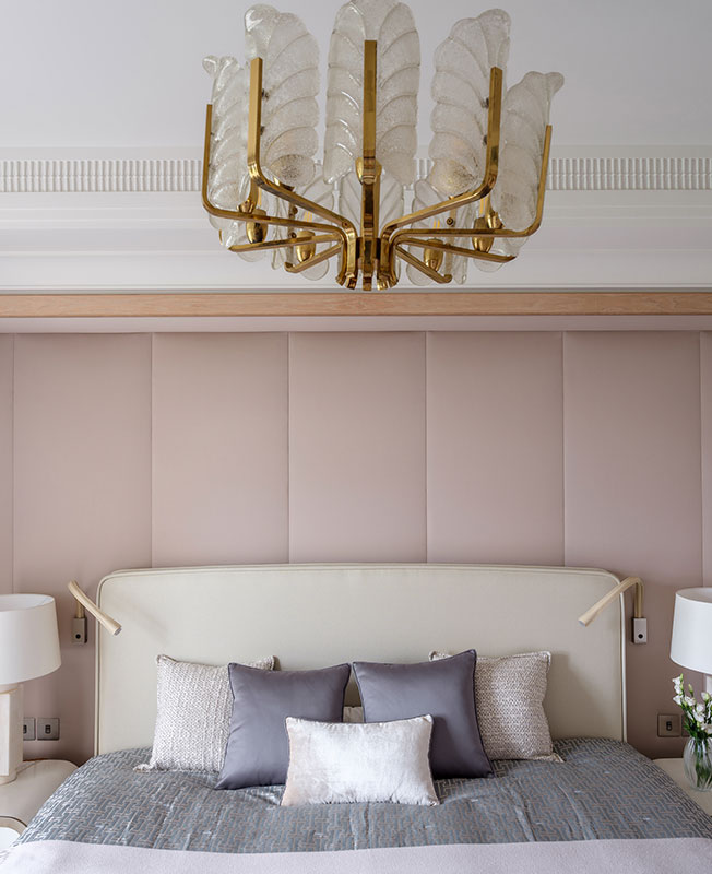 Фрагмент главной спальни. Люстра, 1970-е, Германия. Кровать, Vispring. Прикроватные тумбы, Carakole.