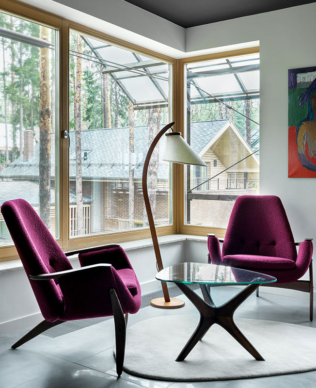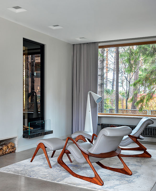 Каминная зона. Кресла Contour Rocking Chair, диз. Владимир Каган, доставлены из Америки. Торшер Marset. Ковер Kover Buro. «Вся мебель для дома подобрана в определенной пластике, без острых углов и с яркой харизмой», — говорит Екатерина Федорова.