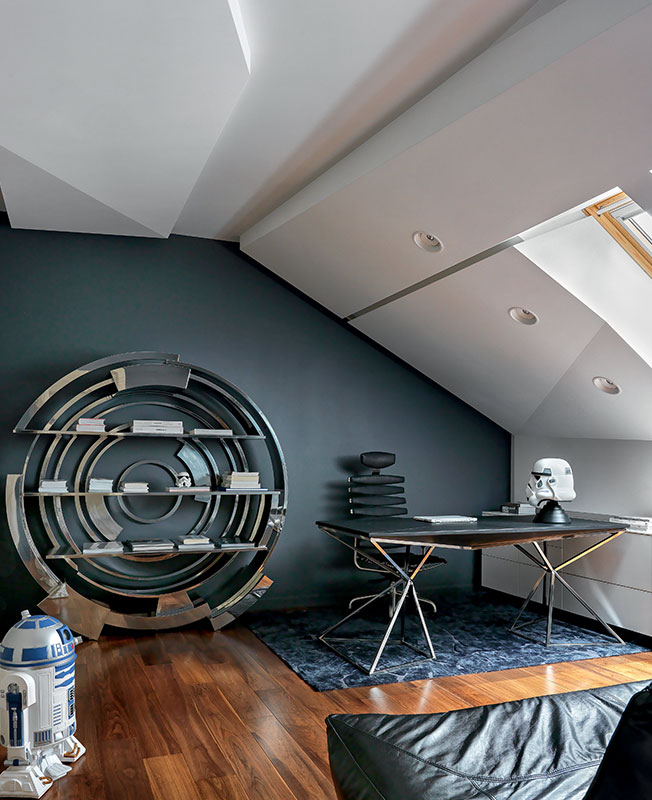 Когда семейная пара с четырехлетним ребенком пригласила Екатерину Федорову оформить дом, дизайнер не ожидала, что запрос будет таким удивительным и сложным: впервые ей встретились заказчики, настолько увлеченные космической тематикой. «У меня собралась огромная папка с материалами, присланными от клиента. До этого я не смотрела ни одну из частей «Звездных войн» — пришлось подробно изучить эту тему».