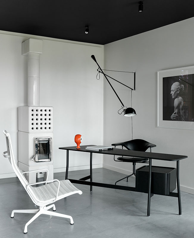 Кабинет хозяйки дома. «Когда клиенты были в отъезде, я решила поэкспериментировать с потолком. Ожидала серьезного разговора за самовольность, но хозяйке понравилась идея выкрасить потолок в черный цвет», — говорит Екатерина Федорова. Печь Castellamonte. Белое кресло Herman Miller.