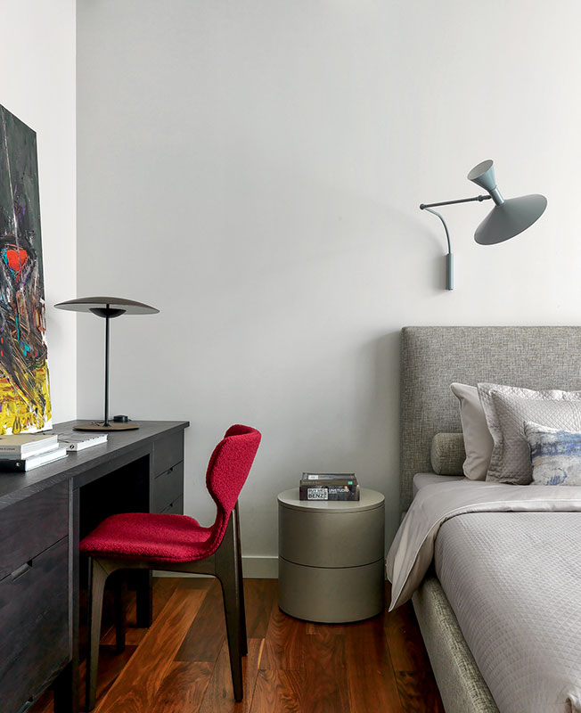 Кабинет хозяйки примыкает к спальне, комнаты образуют красивую анфиладу. Комод Punt, светильник Established & Sons дизайна братьев Буруллек. Живопись: Игорь Михайленко.