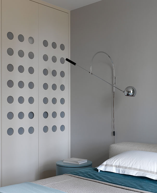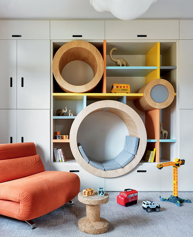 В каждой комнате так или иначе разыграна тема круга — детская не исключение. Шкаф: индивидуальное производство, в центре круглый, дополненный подсветкой шезлонг, куда легко помещается взрослый человек.