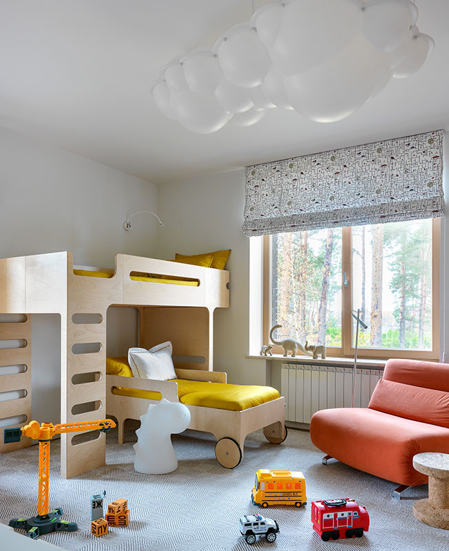 Детская. Потолочный светильник Nemo. Кресло Futura. Кровати Rafa-kids. Шторы Pierre Frey. Ковер изготовлен специально для этой комнаты.
