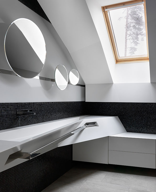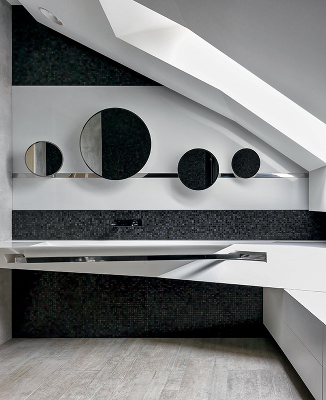 Санузел на третьем, мансардном этаже. Его сложную геометрию дизайнер подчеркнула 3-метровой мойкой из искусственного камня, изготовленной на заказ. Лайтбоксы с поворотными зеркалами напоминают планеты. Смесители Gessi. Мозаика муранского стекла «цвета ночи» (такой оттенок пожелал заказчик) добавляет контрастности.