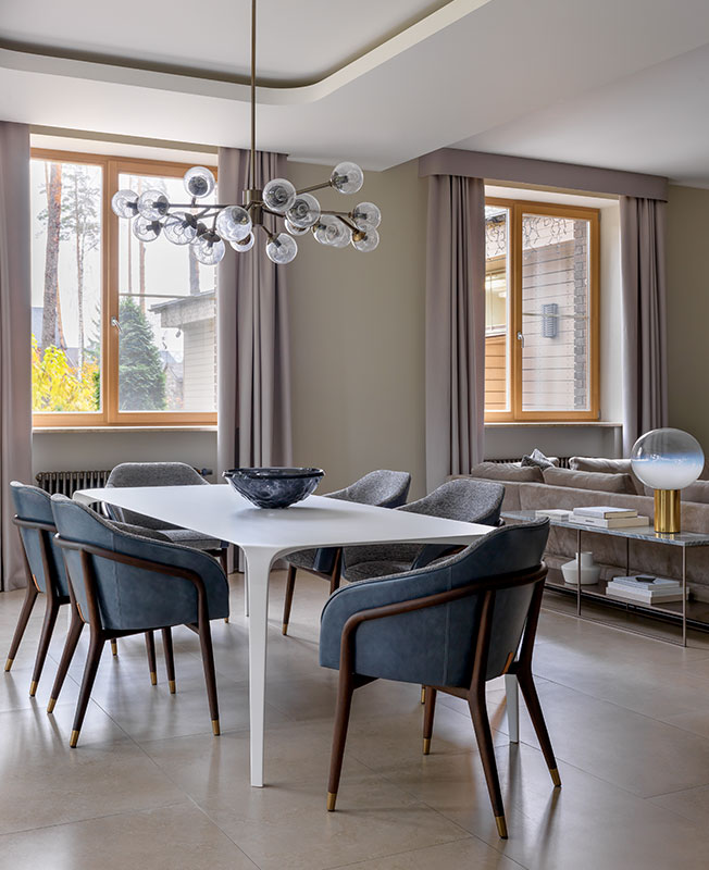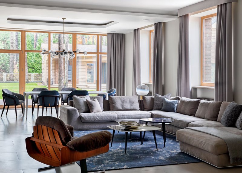 Гостиная. Диван Cierre. Столики Baxter. Люстра Arteriors. Стол B&B Italia, cтулья Ulivi. Кресло, диз. Хорхе Залзупин, приобретено в салоне Krassky. Ковер Kover Buro. Огромные горизонтальные окна — главное достоинство дома. В гостиной длина окна достигает 6 метров.