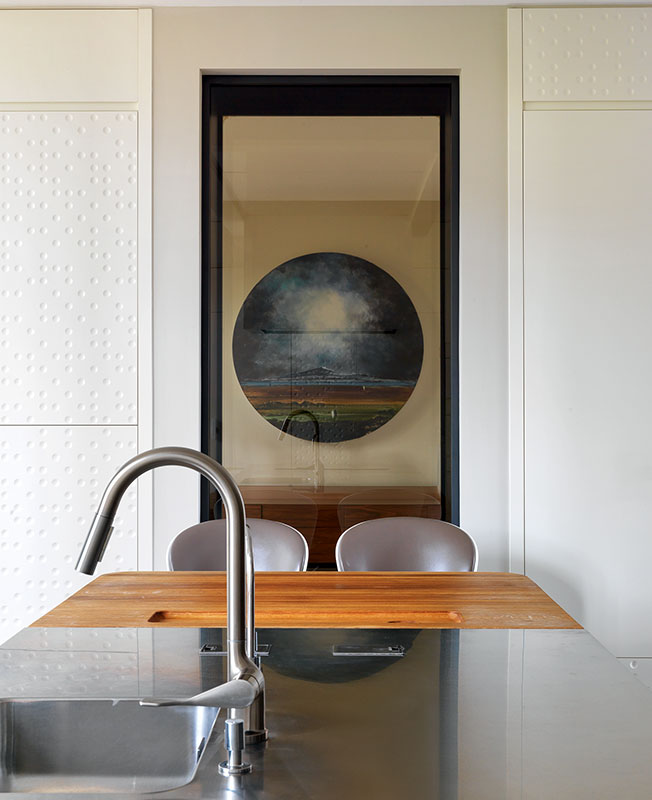 Кухня. Через стеклянный камин можно видеть лайтбокс Даниила Архипенко в каминной зоне. Барные стулья BoConcept.
