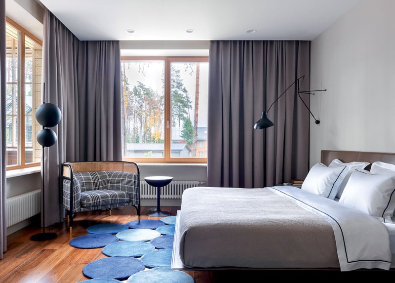 Главная спальня. Кровать B&B Italia. Кресло Thonet. Торшер Oluce, настенный светильник Lampe Gras. Столик Miniforms. Постельное белье Fiori di Venezia. Текстиль Kvadrat.