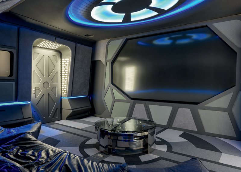 Кульминация технолюкса — домашний кинотеатр на «космическом» третьем этаже. Для него был разработан сложнейший проект, полностью управляемый системой «умный дом». «Окно звездного корабля» нажатием кнопки превращается в гигантский экран. Боковые створки разъезжаются, перекрывая проходы в боковые помещения: в одном из них находится бар с мини-кухней, в другом — система, обслуживающая home cinema. Проектор с обратной проекцией стоит за экраном.