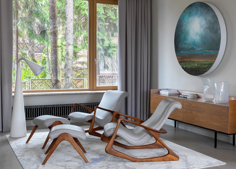 Каминная зона. Кресла Contour Rocking Chair, диз. Владимир Каган, доставлены из Америки. Торшер Marset. Комод Punt. Ковер Kover Buro. Лайтбокс Даниила Архипенко приобретен на выставке Cosmoscow 2017.