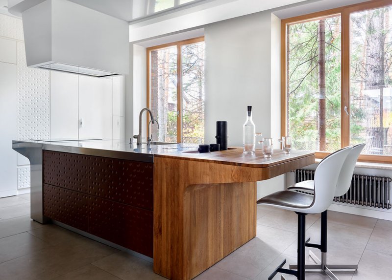 Кухня. В центре 4-метровый остров итальянского бренда Schiffini, диз. Альфредо Хэберли. Одно крыло используется как стол для завтраков, другое — для приготовления пищи. Кожух подвесной вытяжки изготовлен специально для проекта. Бытовые приборы: Miele, Kuppersbusch.
