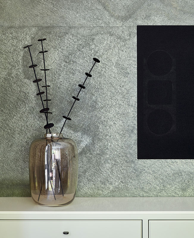 «Серый сланец мы привезли под заказ из Испании — слэб размером 2,5 х 1 м. Полотно выносили на улицу, компоновали рисунок и потом уже монтировали на поверхности стены. Освещение продумано так, чтобы луч света, дневного или искусственного, попадал на стену и она играла переливами оттенков».