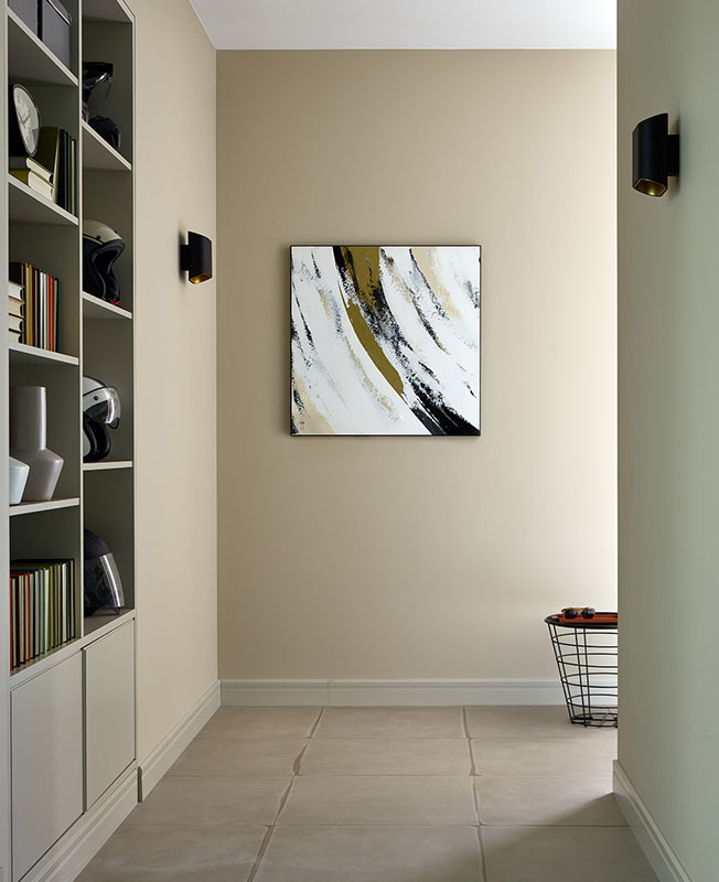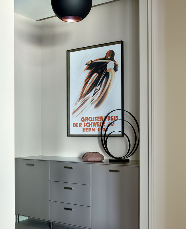 Встроенный шкаф для мотоциклетных шлемов и книг изготовлен по эскизам архитектора. Бра Modular. На полу плитка Provenza. Картина: галерея Carre d'artistes Moscow.