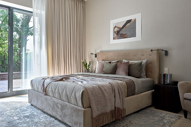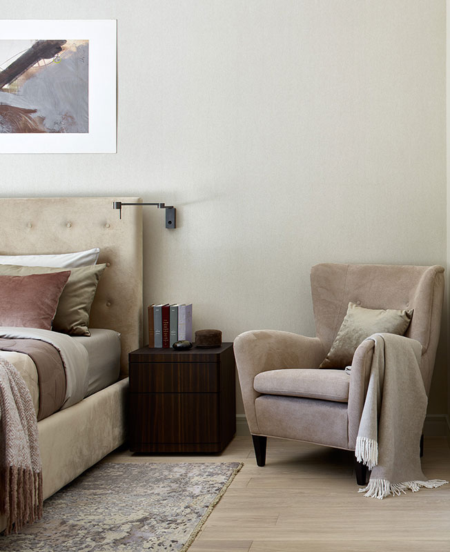 Cпальня. Кровать и кресло Dantone Home. Tумбы Poliform. Бра Contardi. Текстиль BoConcept, Frette. Ковер The Rug Company. На стене картина Ивана Несветайло «Неустойчивое равновесие», галерея ArtBrut Moscow.