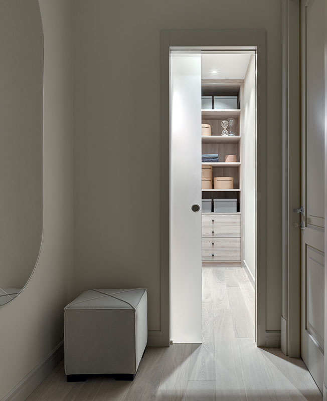 Гардеробная, двери, зеркало, комод и пуф выполнены по эскизам архитектора. Дверные ручки Olivari.