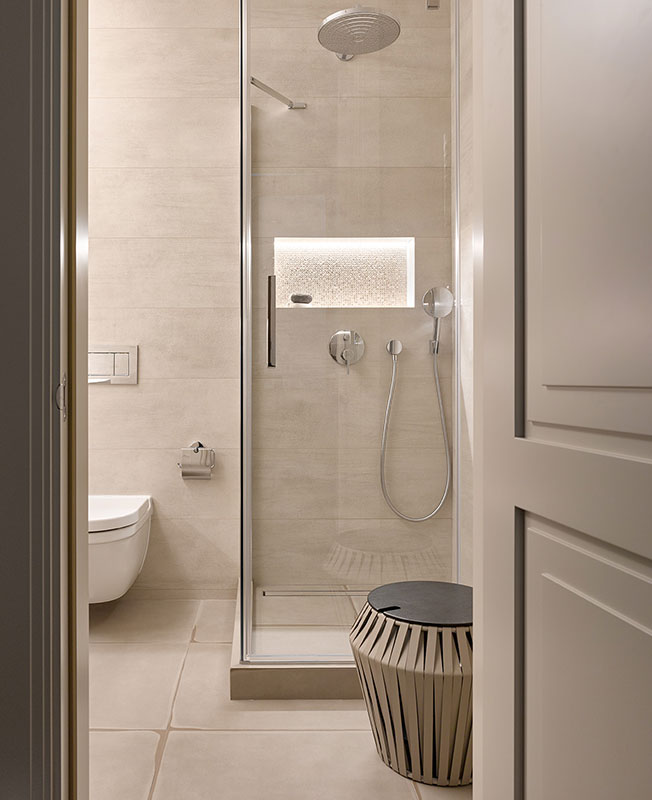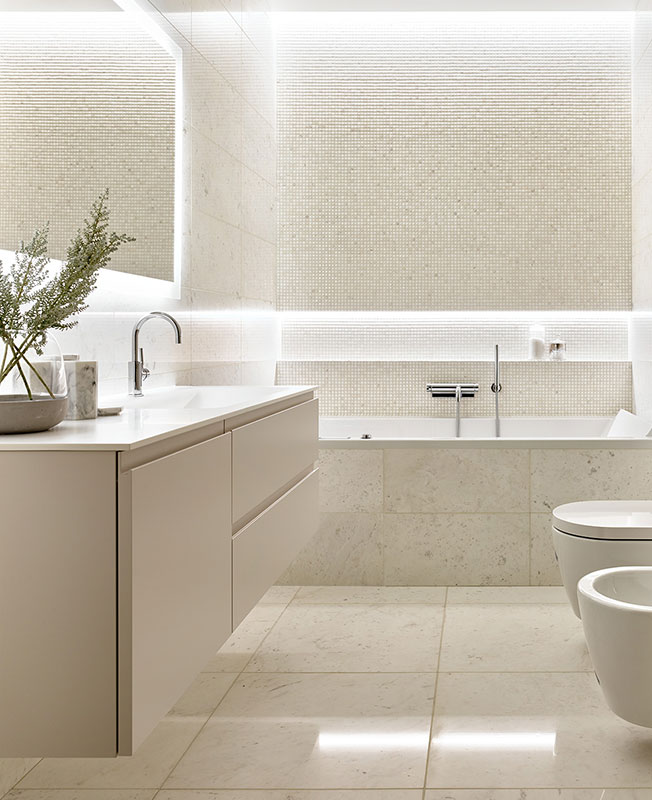 Ванная отделана мрамором Persian White, плитами и мозаикой. Камень сияет, как снег — заказчик любит зиму. Тумба под раковину со столешницей из кориана Arbi. Оборудование Dornbracht, Hansgrohe, Duravit.