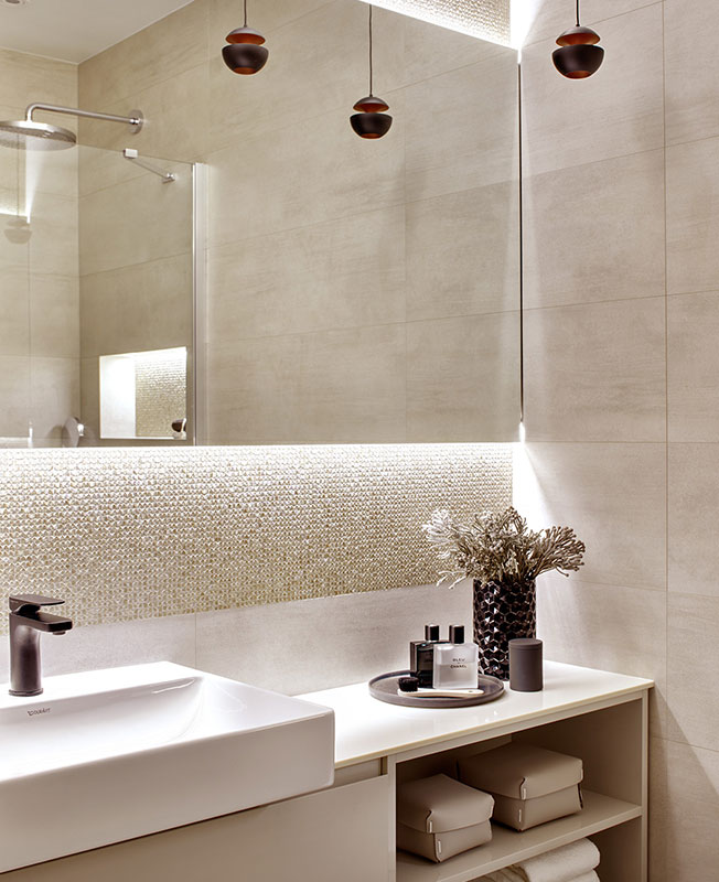 Санузел. Тумба под раковину Arbi. Оборудование Hansgrohe, Duravit. Металлическая мозаика L'Antic Colonial. Настенная плитка Porcelanosa.