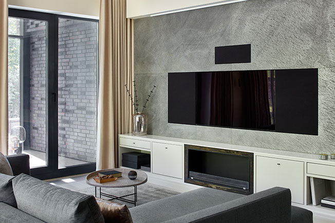 Диван Flexform — важный компонент домашнего кинотеатра. Техническое оснащение: акустика B&W, проигрыватель OPPO, ресивер Marantz, встраиваемый экран со звукопрозрачным полотном Screen Research. Сетевое оборудование Luxul. Автоматический биокамин с дистанционным управлением Decoflame.