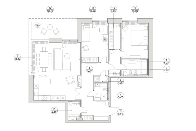 На площади 130 кв. метров спланировано 12 помещений. Больше всего места, 43 кв. метра отведено объединенному пространству гостиной-кухни-столовой. Есть также спальня, гостевая комната, которая впоследствии может стать детской, ванная и мужской санузел, две гардеробные, постирочная, прихожая, два холла, превращенный в веранду балкон. Помещения логично перетекают одно в другое, нет ни одной случайной, «цепляющей» глаз детали. Почему тот или иной предмет стоит именно на этом месте — таких вопросов здесь не возникает.
