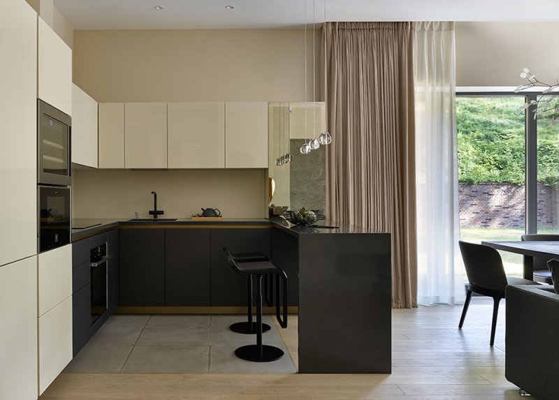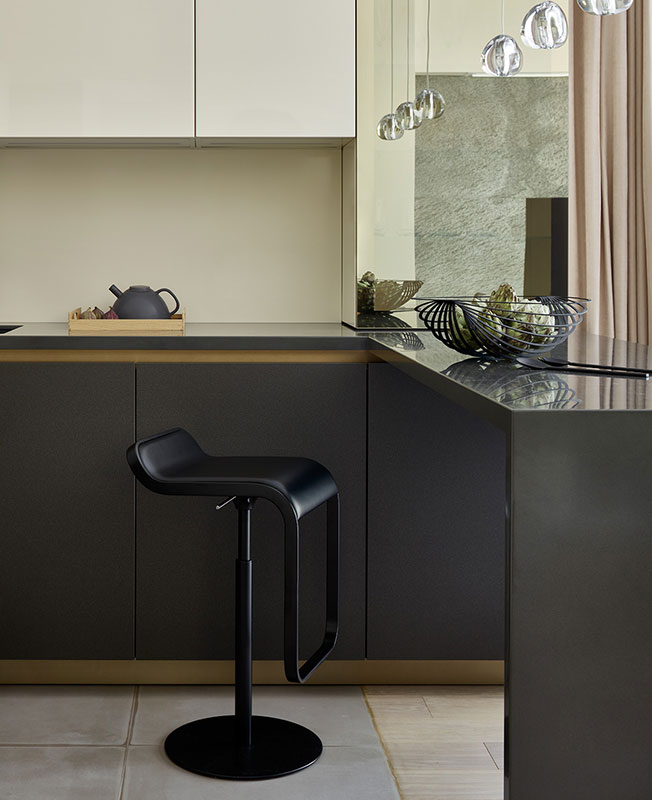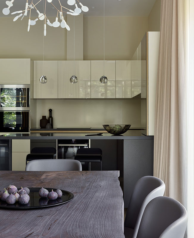 Глянцевые фасады кухни Scic отражают свет, который поступает с улицы. Это добавляет простора и воздуха. Стол изготовлен из горного карагача. «Я долго искала слэбы одного дерева, чтобы они были одинаковой толщины — это редкая древесина», — говорит Инга Кордя.