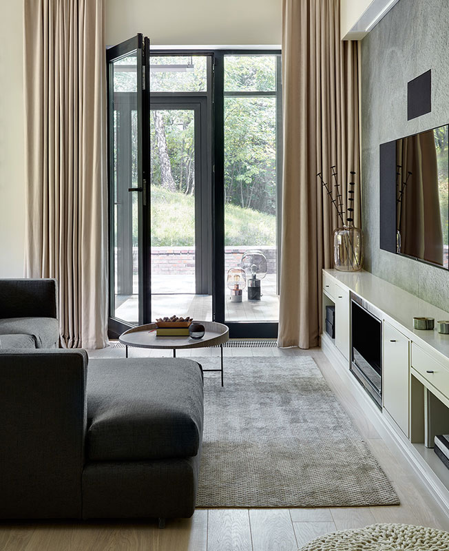 Тумба под ТВ выполнена по эскизам архитектора. Обрамление биокамина также изготовлено на заказ, материал: латунь. Встраиваемый экран со звукопрозрачным полотном Screen Research.