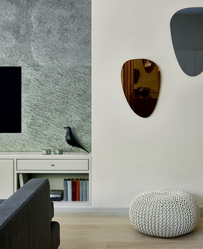 Интерьер продолжает палитру пейзажа за окном. Тумба под технику изготовлена по эскизам автора проекта и выкрашена в цвет стены. Телевизор и 4К-проектор Sony. Скульптура Eames House Bird, Vitra. Зеркала и пуф BoConcept. Стена отделана сланцем L'Antic Colonial.
