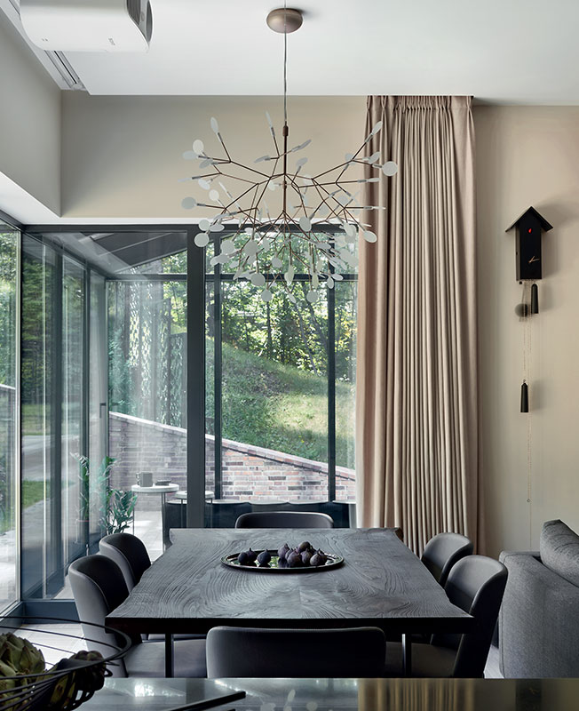 Шторы с электроприводом Somfy. Люстра Moooi. Стол из массива горного карагача выполнен мастерской WoodMood. Стулья Cattellan Italia. Часы с кукушкой ручной работы привезли специально для заказчика из Германии.