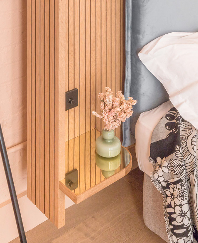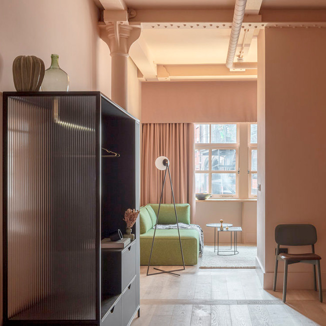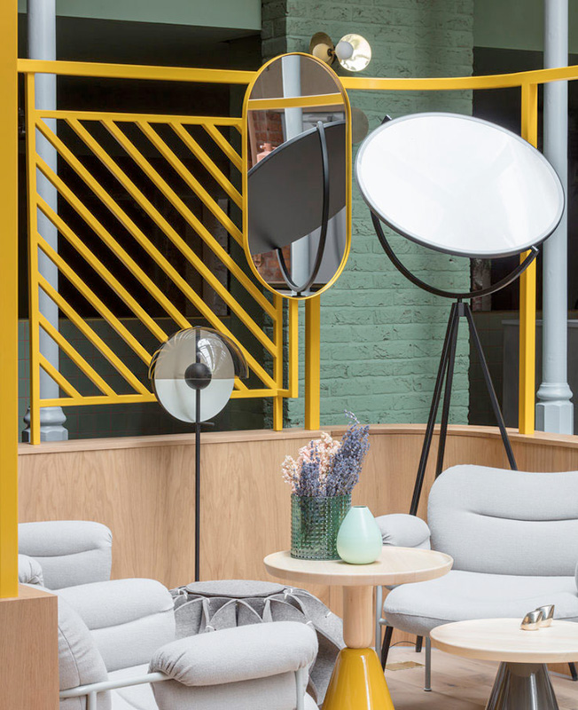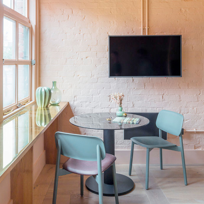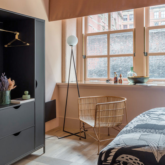 Grzywinski + Pons спроектировали для отеля большую часть мебели и освещение. Выбрали приятные на ощупь материалы и теплую палитру. По словам дизайнеров, цветовая гамма во многом навеяна исследованиям, посвященным коммерческим связям, исторически связывавшим Манчестер с отдаленными и более теплыми и яркими уголками земного шара.