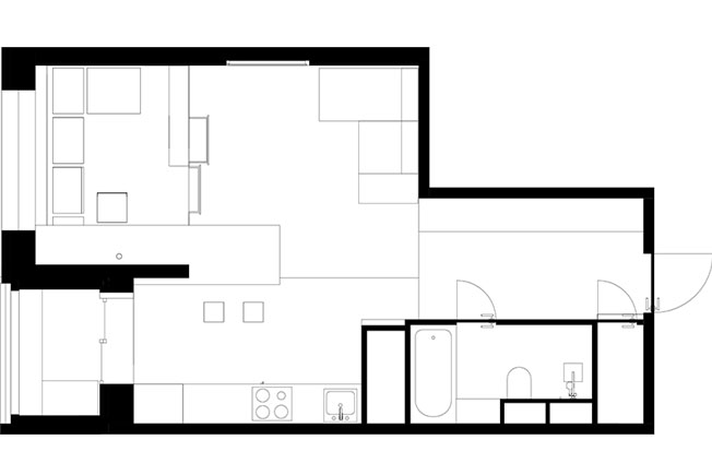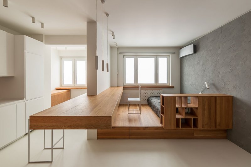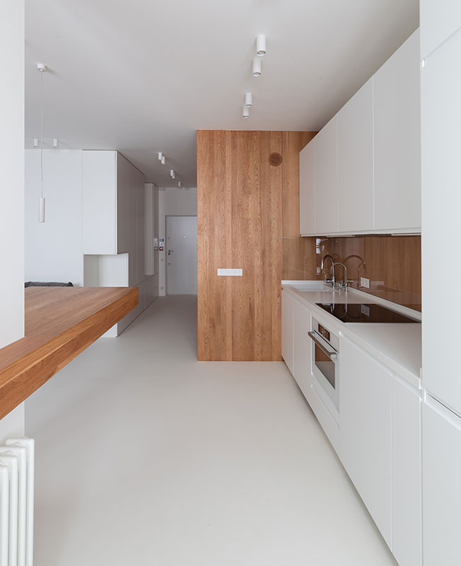Студия Ruetemple создала для молодого человека, работающего в сфере IT-проектирования, минималистичный и практичный интерьер, без лишнего декора. Владелец квартиры 40 кв. метров в новостройке хотел сохранить пространство открытым, не загромождать его дополнительными стенами и дверями. Также все функции — кухню, гостиную, спальню и рабочее место необходимо было оборудовать в одном помещении, но с грамотным зонированием. «Создавая этот интерьер, мы прежде всего думали об организации пространства, эргономике. О том, чтобы оно служило фоном для жизни — так появился белый цвет. Думали о том, чтобы в интерьере было уютно и спокойно — так появилось дерево. Здесь есть простые формы и нет ни одной лишней детали», — рассказывают авторы проекта Александр Кудимов и Дарья Бутахина. nonehttps://www.instagram.com/ruetemple.architects/https://www.facebook.com/ruetemple.architects/http://www.ruetemple.ru/ Перед студией стояла задача выдержать строгую палитру. Основой стал белый — цвет, расширяющий пространство и отражающий солнечный свет. При этом натуральная древесина на нейтральном фоне смотрится очень выразительно. В лаконичном пространстве разместились все необходимые для жизни вещи — кровать, рабочий стол, кухонный гарнитур, места для хранения. В деревянном объеме оборудовали санузел. Отделочные материалы также подбирали минималистичные — наливной белый пол DBSG, для стен и потолка также выбрали штукатурку и краску белого цвета, дубовый мебельный щит, керамогранит Portland с имитацией поверхности бетона в санузле. Все встроенные места для хранения органично вписаны в пространство — белый шкаф в прихожей от Mr.Doors и стеллажи, интегрированные в деревянные объемы. Также для хранения одежды в квартире предусмотрена гардеробная. Вся мебель спроектирована по чертежам студии Ruetemple, в том числе лаконичная кухня производства «Стильные кухни». План квартиры 40 кв. метров. Высота потолков 2,8 м. Бюджет — 2,5 млн. рублей.
