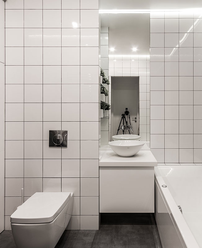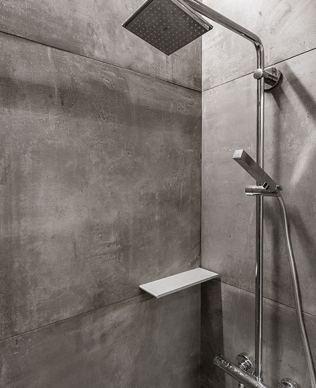 Отделочные материалы также подбирали минималистичные — наливной белый пол DBSG, для стен и потолка также выбрали штукатурку и краску белого цвета, дубовый мебельный щит, керамогранит Portland с имитацией поверхности бетона в санузле.