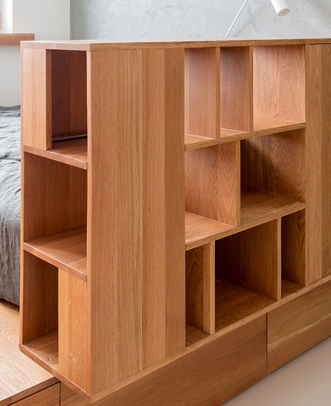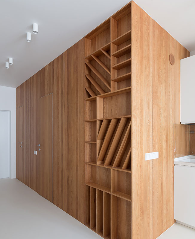 Все встроенные места для хранения органично вписаны в пространство — белый шкаф в прихожей от Mr.Doors и стеллажи, интегрированные в деревянные объемы. Также для хранения одежды в квартире предусмотрена гардеробная. Вся мебель спроектирована по чертежам студии Ruetemple, в том числе лаконичная кухня производства «Стильные кухни».