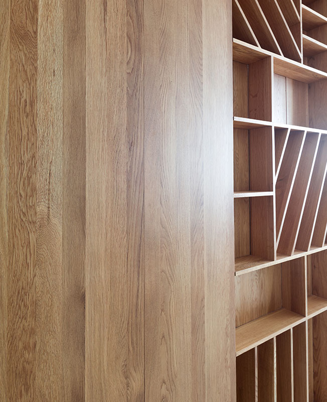 Перед студией стояла задача выдержать строгую палитру. Основой стал белый — цвет, расширяющий пространство и отражающий солнечный свет. При этом натуральная древесина на нейтральном фоне смотрится очень выразительно.