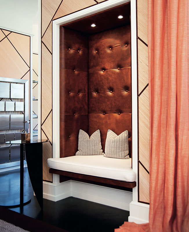 Уголок для уединения: встроенный в нишу диван и столик Pi Console Table, М. Шекели. Панели с геометричным орнаментом — парафраз классических буазери.