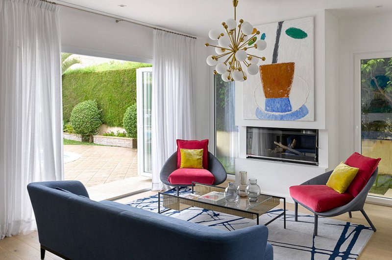 Основой колористической палитры стал белый цвет, из-за постоянно проникающего в дом солнца он здесь особенно яркий, ослепляющий. Цвет расширяет пространство, дает ощущение легкости и свежести. Также он стал идеальным фоном для предметов современного искусства и яркой мебели. В спальнях использовали спокойные пастельные тона — серый, голубой, розовый.