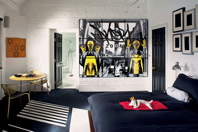 Комната на втором этаже. Пес в короне на кровати — работа японского художника Й. Нары. Черно-бело-желтое полотно: Gilbert & George. Слева стол и стулья М. Матего. Ковер по эскизу художника Ф. Паррено.