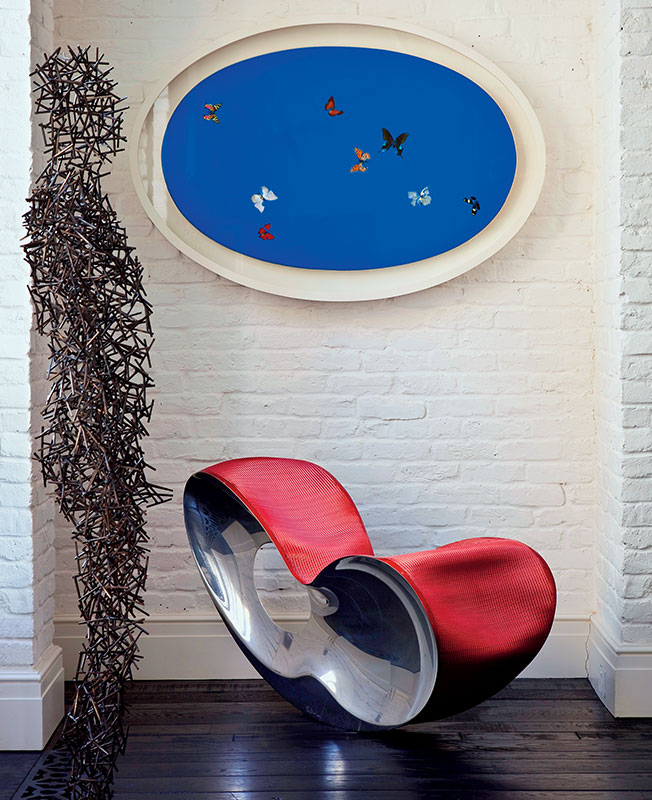Арт-уголок в гостиной. Овальная работа Д. Хёрста Butterfly, под ним кресло-качалка Р. Арада (коллекционный вариант), слева скульптура Э. Гормли.