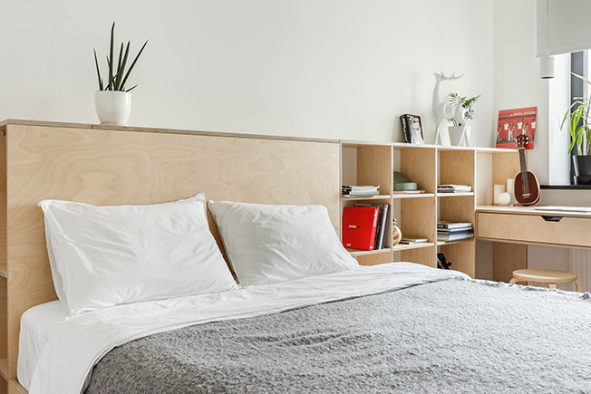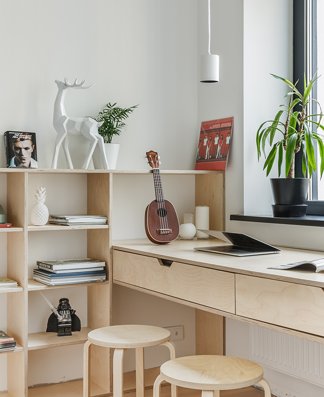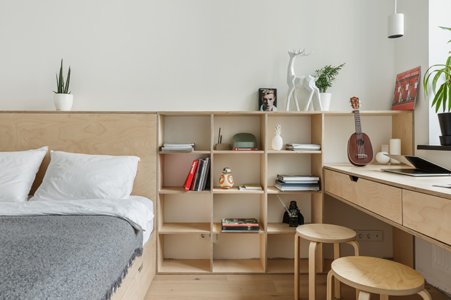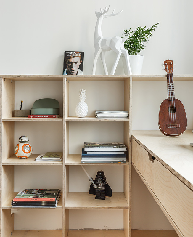 Для комплекса объединяющего рабоочий стол, стеллаж и кровать, архитекторы применили березовую фанеру. Любимый материал классиков скандинавского дизайна демонстрирует красивую фактуру.