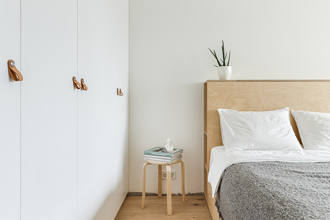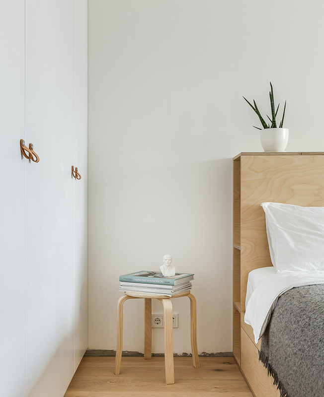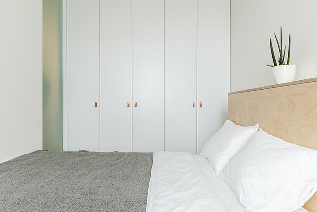 Система хранения изготовлена на заказ. Кожаные ручки — изысканная деталь в минималистском интерьере. Для кровати использована березовая фанера