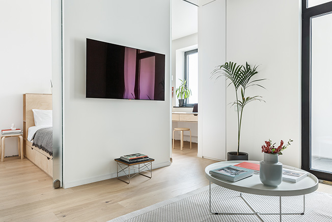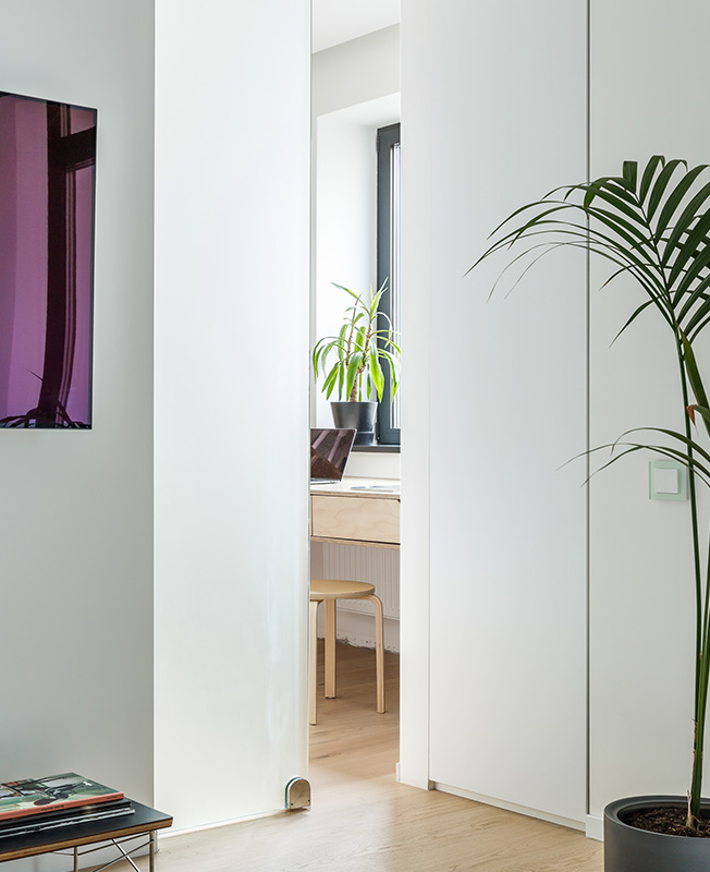 Так как у спальни отняли целых 60 см длины, места для прохода между изножьем кровати и стеной не осталось. Архитекторы нашли выход: установили две раздвижные двери между гостиной и спальней. Они позволили подходить к кровати с обеих сторон и использовать площадь максимально эффективно.