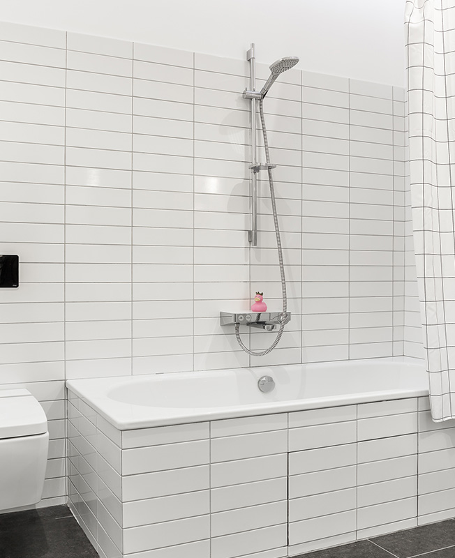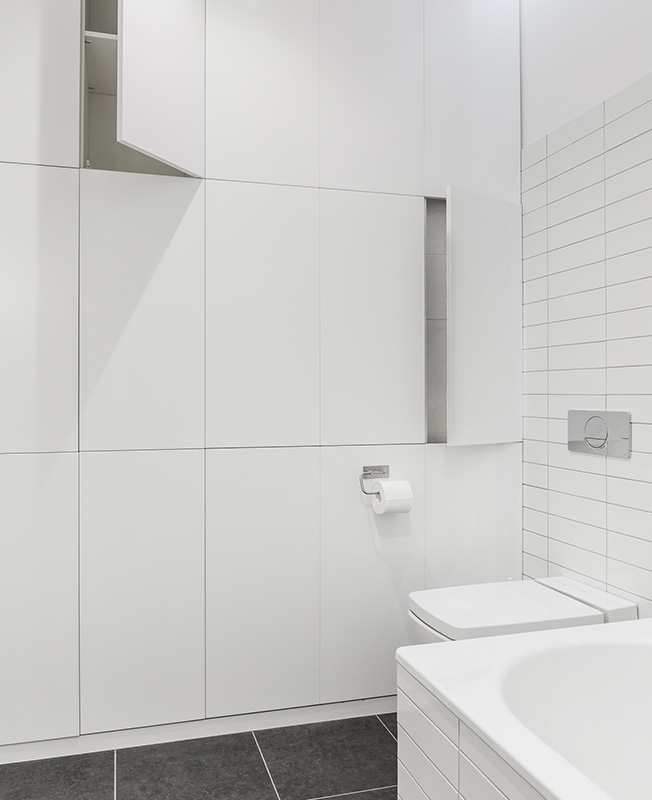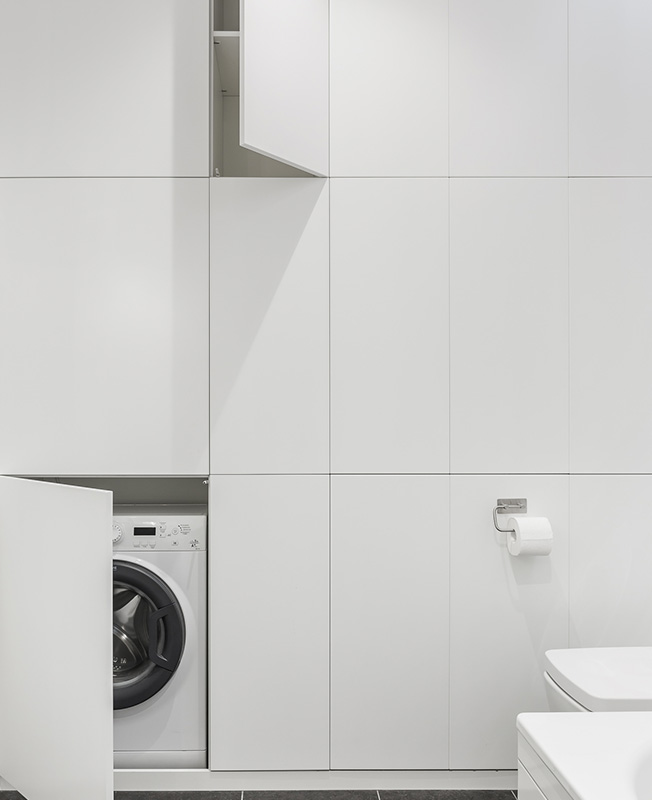 Ванную архитекторы немного увеличили за счет коридора, благодаря этому удалось организовать хозяйственный шкаф для бытовой химии, белья и стиральной машины.