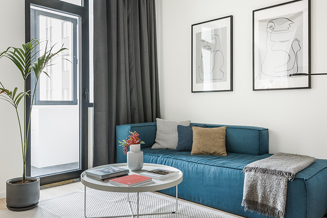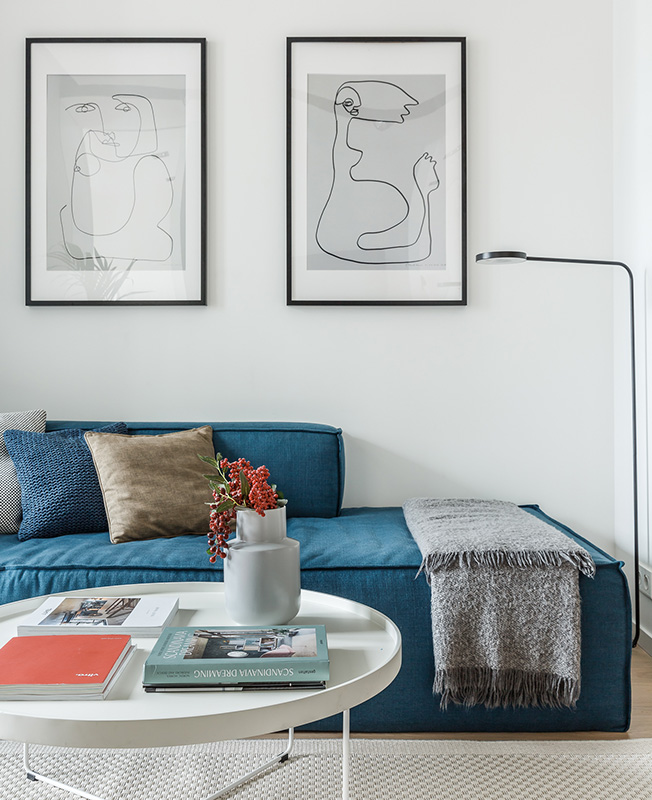 Черные линии делают интерьер графичным, архитектурным. Диван изготовлен на заказ по эскизам авторов проекта. Торшер и постеры Ikea, ковер Zara Home.