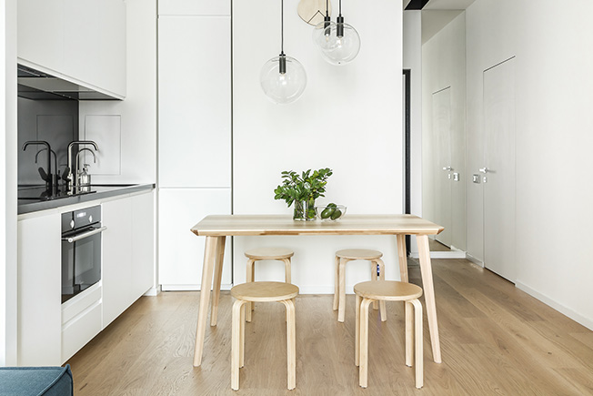 Белый цвет плюс светлое дерево — беспроигрышное сочетание для современного интерьера.