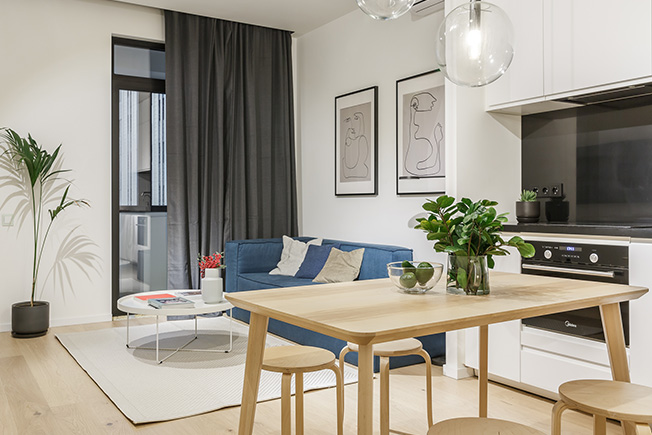 «Что касается функциональности, мы не пожертвовали ничем. У нас получилась полноценная кухня с обеденным столом, за которым можно разместить до шести человек. В гостиной тоже есть все необходимое: мягкая группа, столик, торшер, телевизор».