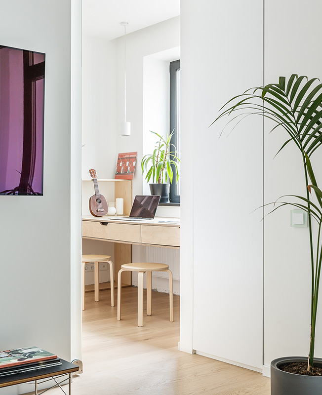 Хозяева хотя и архитекторы, но еще молоды, опасались ошибиться, поэтому пригласили опытных друзей. Пространство площадью 45 кв. метров всего с двумя окнами, одно из которых балконное, было непростым исходником. «Мы не стали кардинально менять квартиру в плане — ванная, кухня, гостиная, спальня остались на своих местах. Мы изменили ее функционально — переосмыслили под быт современного человека», — говорят Анастасия и Антон.