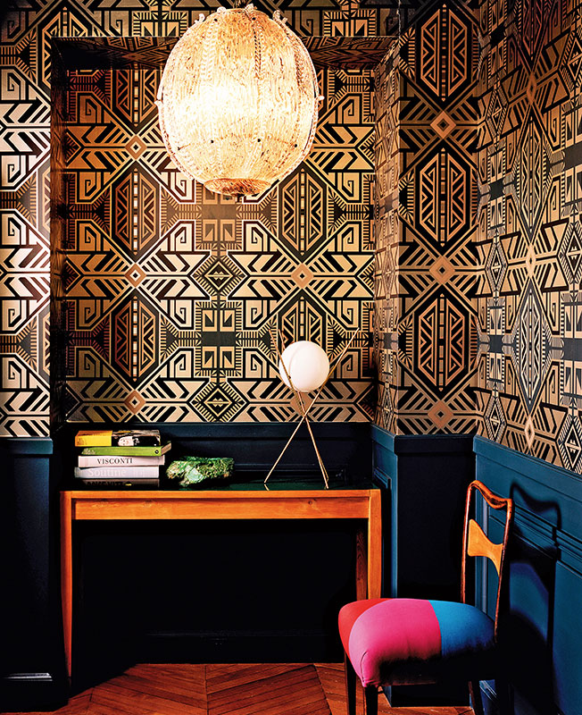 В прихожей одна стена оклеена орнаментальными обоями Osborne & Little. Винтажная люстра Barovier & Toso, стул, диз. М. Гампер.