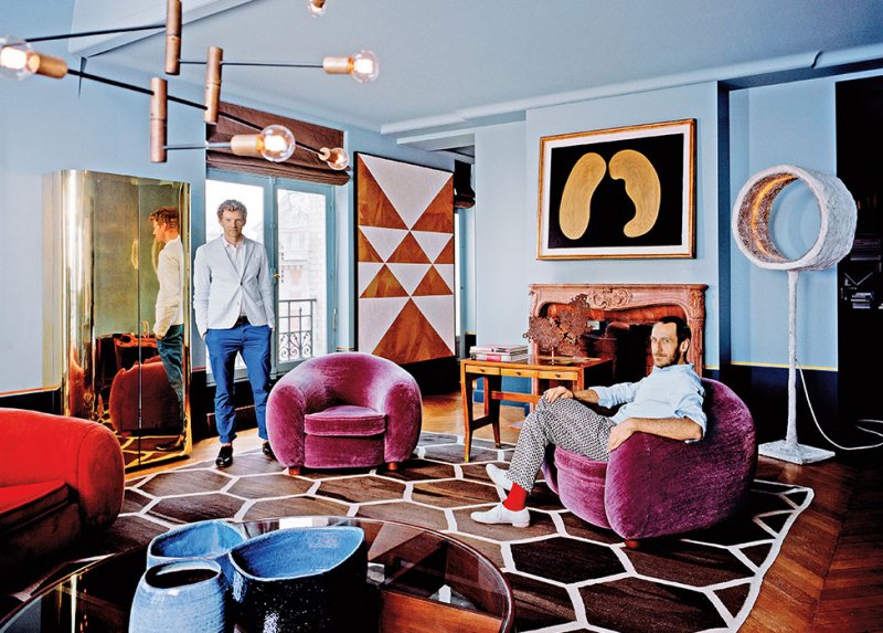 Тон в двухсветной гостиной задает огромное окно с историческим переплетом. Специально, чтобы любоваться великолепным видом, поставлены две банкетки. Торшер-пальма, диз. А. Лелли, — любимый объект хозяев. Под него подобрана ткань шторы. Диван Ж. Руайера. Бритт Моран и Эмильяно Сальчи устроились в Париже как модные итальянцы. Ярко, неожиданно и красиво. Дуэт Dimore Studio часть времени проводит здесь, в 250-метровой квартире в доме середины XIX века. Бритт и Эмилио выбрали район вокруг самого старого аббатства Парижа, памятника романской архитектуры на левом берегу Сены. Здесь преобладает классическая застройка с огромными подъездами, широкими лестницами и высокими мансардными крышами. Удачно была найдена квартира на верхнем этаже, откуда открывается изумительный панорамный вид на город. Лестница с металлическим ограждением ведет в мезонин. Вертикаль поддержана светильником, спроектированным Dimore Studio. У стены — их же консоль, желтое кресло, диз. М. Гампер, и работа Э. Кастеллани. Столовая. Стол и стулья по эскизам М. Гампера. Камин оформлен двумя порталами, повторяющими профиль лепнины и крашенными в синий цвет. На стене — работа Л. Фонтаны. В прихожей видна картина М. Хагена. Светильник, диз. А. Лелли. Подсвечники, диз. Б. Л. Вуд. К тому же есть второй уровень в мезонине — раньше в нем жила прислуга. Интрига интерьера — в сочетании классической коробки и современного наполнения. Которое также неоднородно. С одной стороны, хрестоматийный дизайн вроде дивана «Полярный медведь» французского гуру Жана Руайера 1946 года, с другой — модный светильник-артефакт из эпоксидной смолы испанца Начо Карбонеля. Как и в своих проектах, в квартире партнеры умело смешивают свои вкусы: Бритт Моран придерживается традиций, Эмилиано добавляет модности. Но оба сходятся во мнении: «Искусство и дизайн — то, на чем весь образ интерьера сидит, как на якоре». Брит Моран и Эмильяно Сальчи в гостиной. Диван и кресла Ours Polaire («Полярный медведь»), Ж. Руайер. На полу иранский ковер, справа в углу — светильник Н. Карбонеля Luciferase, галерея BSL. Limited edition. Слева золотой шкаф, диз. Ф. Вамбак. Спальня. Ткань занавесей и обои в модном диалоге: геометрия уравновешивает пышный анималистический узор. У изголовья кровати — винтажный светильник. Сами хозяева свой дом описывают как «микс с сильным итальянским креном». Эмильяно — поклонник великого архитектора Джо Понти — знает его творчество досконально. Малую гостиную украшают два столика мэтра, а в коридоре стоит консоль. Много предметов от восходящей звезды коллекционного дизайна Мартино Гампера. «Мартино —единственный автор, — считает Эмильяно, — который делает актуальные предметы, одновременно раскланиваясь со своими предшественниками, и в первую очередь с Понти». Дух Италии поддерживают знаменитые художники — Лучио Фонтана, Энрико Кастеллани, Сильвано Боццалини, — а также люстра муранского стекла Barovier