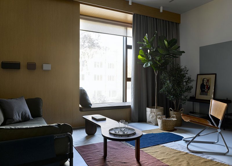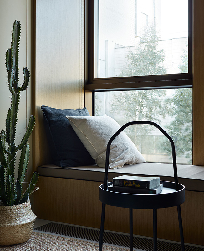 Низкий подоконник архитектор превратила в удобную лежанку. Конструкция скрывает радиаторы отопления.
