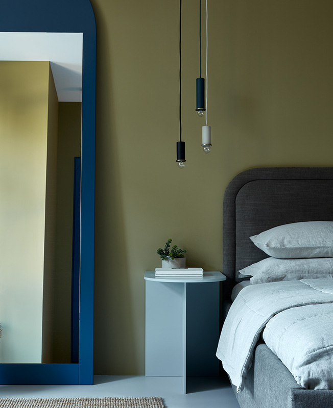 Александра выбрала мягкую серую палитру, ее оживляют небесно-голубой в гостиной, в спальне появляются оливковый и насыщенный синий — в таком сочетании можно углядеть средиземноморский колорит. Спальня оказалась ярче, чем гостиная, хотя принято считать, что все должно быть наоборот.