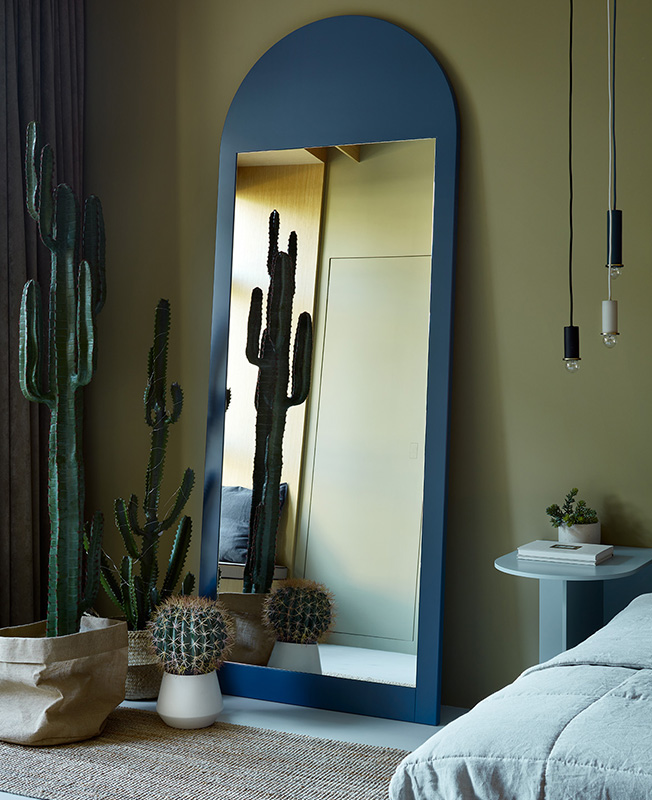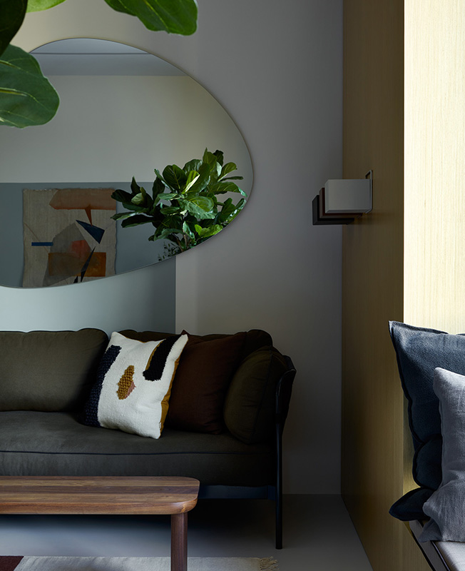Гостиная. Диван Hay. Зеркало изготовлено в мастерской Stameska. Столик-скамья Kim, диз. Лука Никетто для De La Espada. Ковры и декоративные подушки Ferm Living. Растения Treez Collection.