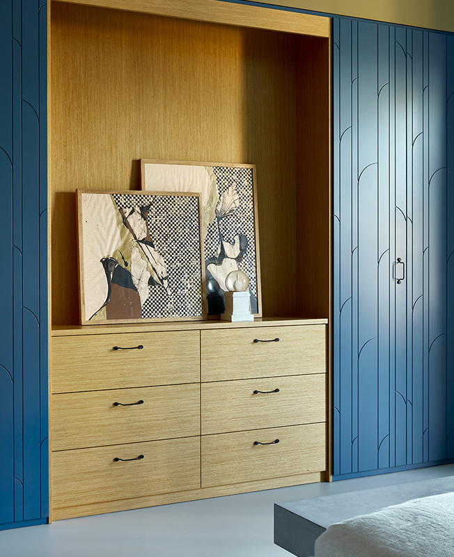 Спальня. Система хранения изготовлена на заказ по эскизам архитектора. Фурнитура Superfront. Синий цвет фасадов гармонирует с золотистым тоном дерева.