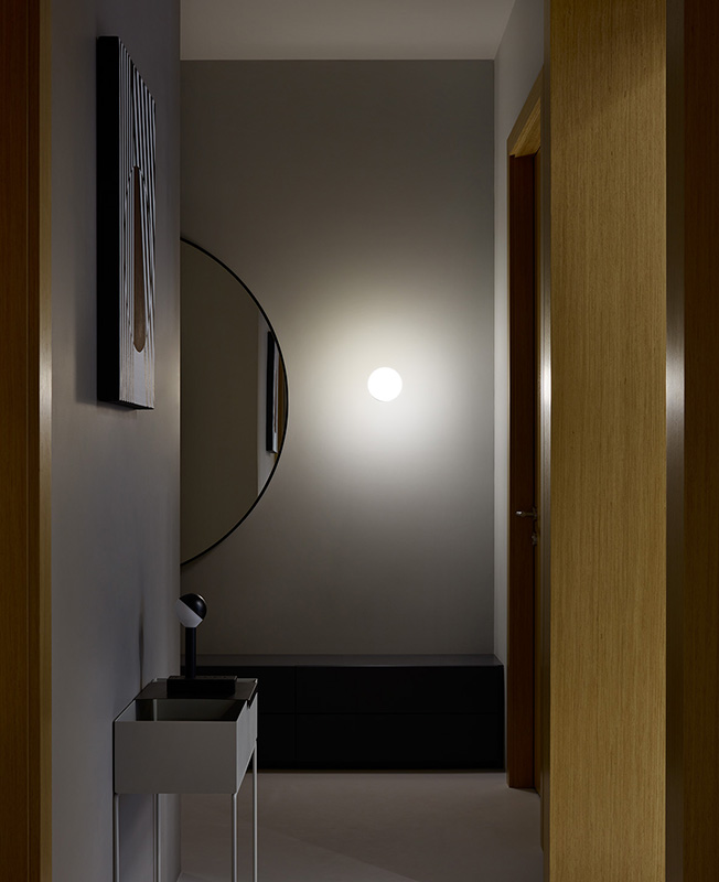 Прихожая. Архитектор эффектно поиграла масштабами: расположила рядом два круглых предмета контрастных размеров. Зеркало изготовлено студией Stameska, бра Atelier Areti. Комод выполнен по эскизам архитектора.
